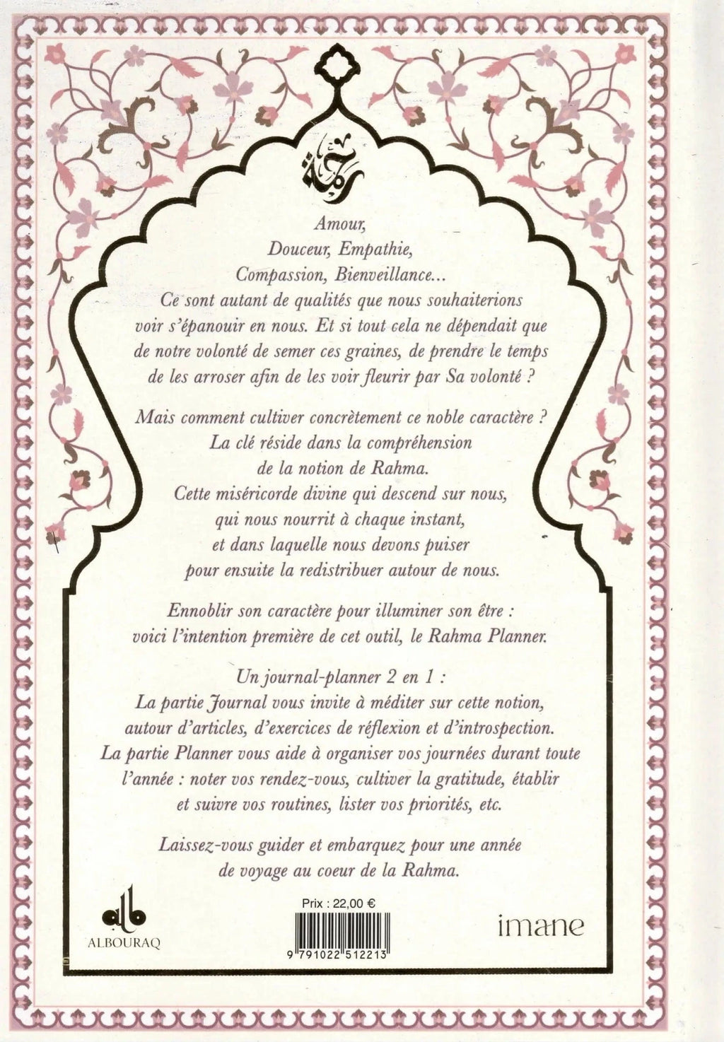 Le Rahma Planner est bien plus qu'un simple agenda : c'est un outil de transformation spirituelle et personnelle conçu pour cultiver la miséricorde divine en soi. Cet ouvrage hybride fusionne journal de réflexion et planner pratique pour vous guider dans l'épanouissement des plus nobles qualités : l'amour, la douceur, l'empathie, la compassion et la bienveillance. Découvrez comment puiser dans la notion de Rahma (la miséricorde divine) pour illuminer votre être et rayonner autour de vous.